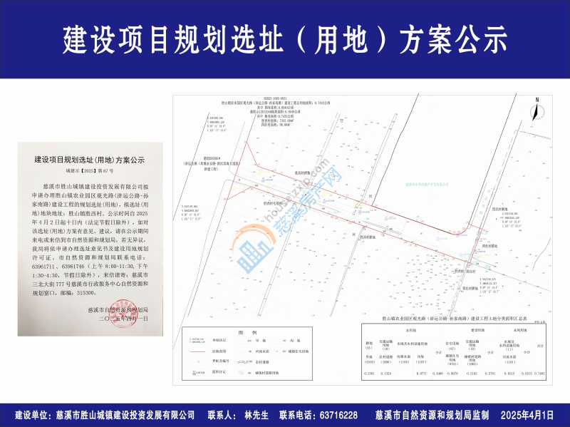 慈溪市胜山城镇建设投资发展有限公司拟申请办理胜山镇农业园区观光路(浒运公路-孙家南路)建设工程的规划选址(用地),拟选址(用地)地块地址:胜山镇胜西村。公示时间自2025年4月2日起十日内(法定节假日除外),如对该选址(用地)方案有意见、建议,请在公示期间来电或来信到市自然资源和规划局。若无异议,我局将依申请办理选址意见书及建设用地规划许可证。市自然资源和规划局联系电话:63961711、63961746(上午8:00-11:30,下午1:30-4:30,节假日除外),来信请寄:慈溪市三北大街777号慈溪市行政服务中心自然资源和规划窗口,邮编:315300。