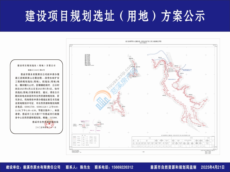 慈溪市原水有限责任公司拟申请办理甬江流域翠屏山北麓治理--邵岙水库扩容工程的规划选址(用地),拟选址(用地)地址:横河镇大山村,匡堰镇乾炳村。公示时间自2025年4月22日至2025年5月6日,如对该选址(用地)方案有意见、建议,请在公示期间来电或来信到市自然资源和规划局。若无异议,我局将依申请办理选址意见书及建设用地规划许可证。市自然资源和规划局联系电话:63961739、63961126(上午8:00-11:30,下午1:30-4:30,节假日除外),来信请寄:慈溪市三北大街777号慈溪市行政服务中心自然资源和规划局,邮编:315300。