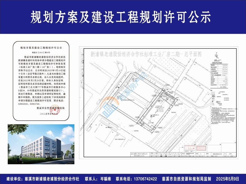 慈溪市新浦镇老浦股份经济合作社拟在新浦镇老浦村向我局申请办理建设工程规划许可的规划方案及建设工程规划许可审批变更(标准工业厂房二期(1#厂房)),现将相关资料予以公示。公示时间自2025年5月10日起十日内(法定节假日除外),凡是与本建设工程有重大利害关系的公民、法人以及其他组织,应在2025年月5月20日前,持本人身份证明、证明有利害关系存在的证据材料,向我局申报(慈溪市三北大街777号慈溪市行政服务中心D区98、99号慈溪市自然资源和规划窗口),依法行使陈述、申辩以及申请听证等权利。逾期不申报的,视为放弃上述权利,下步我局将依申请办理建设工程规划许可变更。联系电话:63961810,63961748。