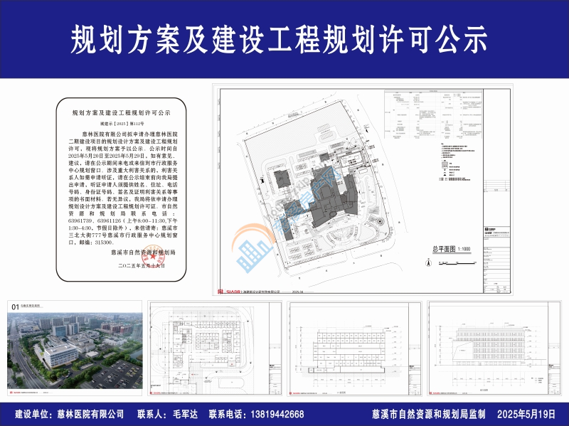 慈林医院有限公司拟申请办理慈林医院二期建设项目的规划设计方案及建设工程规划许可,现将规划方案予以公示。公示时间自2025年5月20日至2025年5月29日,如有意见、建议,请在公示期间来电或来信到市行政服务中心规划窗口。涉及重大利害关系的,利害关系人如需申请听证,请在公示结束前向我局提出申请,听证申请人须提供姓名、住址、电话号码、身份证号码、签名及证明利害关系等事项的书面材料。若无异议,我局将依申请办理规划设计方案及建设工程规划许可证。市自然资源和规划局联系电话:63961739、63961126(上午8:00-11:30,下午1:30-4:30,节假日除外),来信请寄:慈溪市三北大街777号慈溪市行政服务中心规划窗口,邮编:315300。