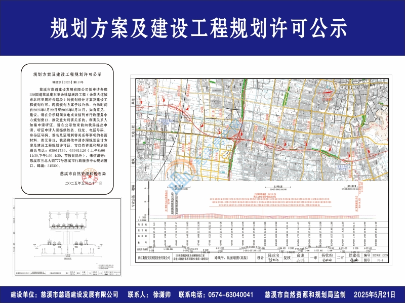 慈溪市慈通建设发展有限公司拟申请办理228国道慈溪庵东至余姚梨洲段工程(余慈大道城市北环至周浒公路段)的规划设计方案及建设工程规划许可,现将规划方案予以公示。公示时间自2025年5月22日至2025年5月31日,如有意见、建议,请在公示期间来电或来信到市行政服务中心规划窗口。涉及重大利害关系的,利害关系人如需申请听证,请在公示结束前向我局提出申请,听证申请人须提供姓名、住址、电话号码、身份证号码、签名及证明利害关系等事项的书面材料。若无异议,我局将依申请办理规划设计方案及建设工程规划许可证。市自然资源和规划局联系电话:63961739、63961126(上午8:00-11:30,下午1:30-4:30,节假日除外),来信请寄:慈溪市三北大街777号慈溪市行政服务中心规划窗口,邮编:315300。
