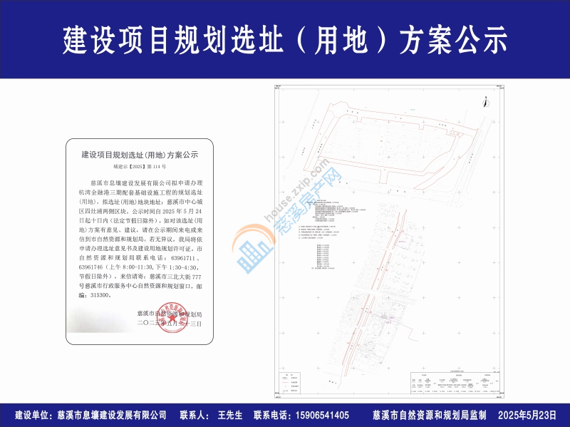 慈溪市息壤建设发展有限公司拟申请办理杭湾金融港三期配套基础设施工程的规划选址(用地),拟选址(用地)地块地址:慈溪市中心城区四灶浦两侧区块。公示时间自2025年5月24日起十日内(法定节假日除外),如对该选址(用地)方案有意见、建议,请在公示期间来电或来信到市自然资源和规划局。若无异议,我局将依申请办理选址意见书及建设用地规划许可证。市自然资源和规划局联系电话:63961711、63961746(上午8:00-11:30,下午1:30-4:30,节假日除外),来信请寄:慈溪市三北大街777号慈溪市行政服务中心自然资源和规划窗口,邮编:315300。