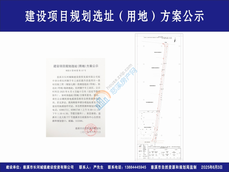 慈溪市长河城镇建设投资发展有限公司拟申请办理长河镇宁丰工业区提升改造项目—基础设施工程(规划七路)的规划选址(用地),拟选址(用地)地块地址:长河镇宁丰工业区。公示时间自2025年6月4日起十日内(法定节假日除外),如对该选址(用地)方案有意见、建议,请在公示期间来电或来信到市自然资源和规划局。若无异议,我局将依申请办理选址意见书及建设用地规划许可证。市自然资源和规划局联系电话:63961711、63961746(上午8:00-11:30,下午1:30-4:30,节假日除外),来信请寄:慈溪市三北大街777号慈溪市行政服务中心自然资源和规划窗口,邮编:315300。
