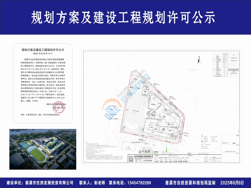 慈溪市住房发展投资有限公司拟申请变更新潮塘6#地块建设项目(文锦学校二期)的规划设计方案及建设工程规划许可,现将规划方案予以公示。公示时间自2025年6月7日-2025年6月16日,如有意见、建议,请在公示期间来电或来信到市行政服务中心自然资源和规划窗口。涉及重大利害关系的,利害关系人如需申请听证,请在公示结束前向我局提出申请,听证申请人须提供姓名、住址、电话号码、身份证号码、签名及证明利害关系等事项的书面材料。若无异议,我局将依申请办理规划设计方案及建设工程规划许可证。市自然资源和规划局联系电话:63961126、63961739(上午8:00-11:30,下午1:30-4:30,节假日除外),来信请寄:慈溪市三北大街777号慈溪市行政服务中心97#-101#窗口,邮编:315300。