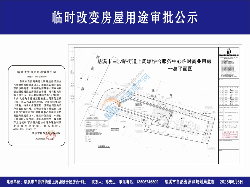 慈溪市白沙路街道上周塘股份经济合作社拟将新城大道以东,周旺路以南的慈溪市白沙路街道上周塘综合服务中心向我局申请办理临时改变房屋用途审批,现将相关资料予以公示。公示时间自2025年6月7日起十日内,凡是与本建设工程有重大利害关系的公民、法人以及其他组织,应在2025年6月16日前,持本人身份证明、证明有利害关系存在的证据材料,向我局申报(慈溪市三北大街777号慈溪市行政服务中心慈溪市自然资源和规划窗口),依法行使陈述、申辩以及申请听证等权利。逾期不申报的,视为放弃上述权利,下步我局将依申请办理临时改变房屋用途审批。联系电话:63961739,63961126。