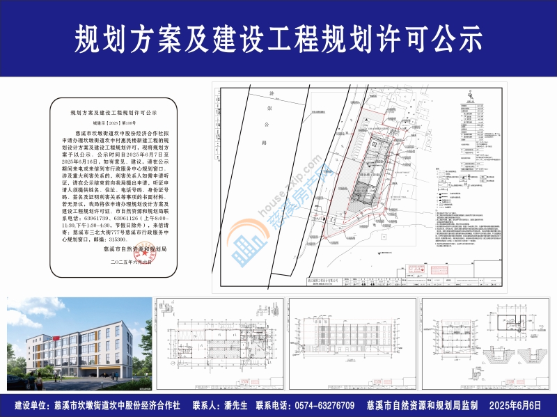 慈溪市坎墩街道坎中股份经济合作社拟申请办理坎墩街道坎中村惠民楼新建工程的规划设计方案及建设工程规划许可,现将规划方案予以公示。公示时间自2025年6月7日至2025年6月16日,如有意见、建议,请在公示期间来电或来信到市行政服务中心规划窗口。涉及重大利害关系的,利害关系人如需申请听证,请在公示结束前向我局提出申请,听证申请人须提供姓名、住址、电话号码、身份证号码、签名及证明利害关系等事项的书面材料。若无异议,我局将依申请办理规划设计方案及建设工程规划许可证。市自然资源和规划局联系电话:63961739、63961126(上午8:00-11:30,下午1:30-4:30,节假日除外),来信请寄:慈溪市三北大街777号慈溪市行政服务中心规划窗口,邮编:315300。