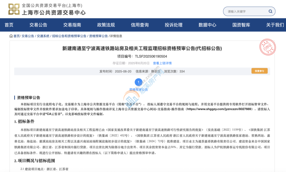 6月20日,新建南通至宁波高速铁路(通苏嘉甬高铁)站房及相关工程施工总价承包招标及监理招标资格预审公告发布。