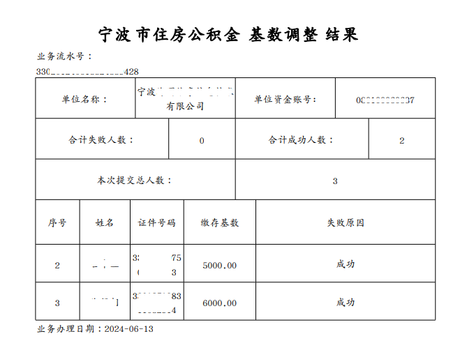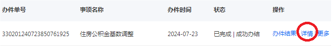 (4)公积金基数调整业务提交后务必以PDF明细为准,可在浙江政务服务网“我的办件”中查询变更人员名单,具体路径为:企业专属服务-办件记录-事项右侧点“办件结果”,或直接通过单位职工信息查询确认办件结果;公积金比例调整为整笔业务,成功办结后看详情即可。