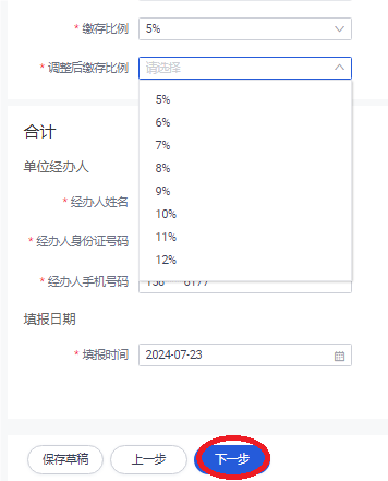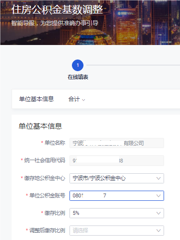 进入填表页面,选择中心、单位账号后,返显原“缴存比例”;选择“调整后缴存比例”,点“下一步”,上传材料并提交。