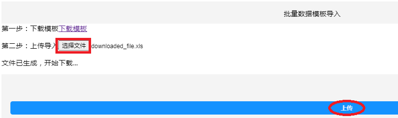 点击“选择文件”选择已保存的文件,点“上传”提示导入成功后点“完成”。