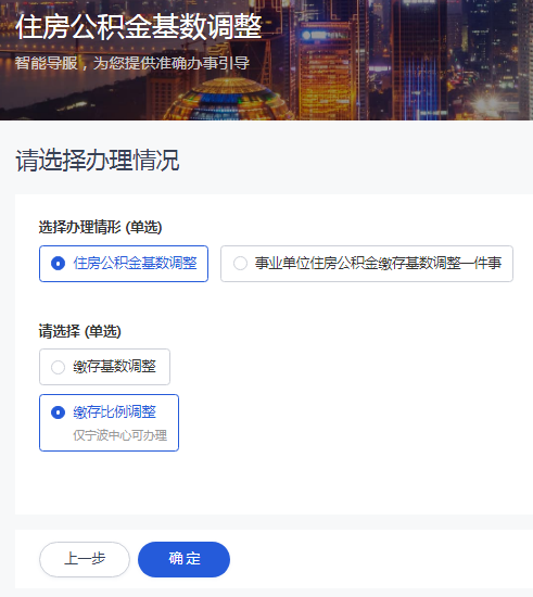 第三步:选择办理情形—“住房公积金基数调整”(注意:事业单位也选“住房公积金基数调整”)。只调整基数的选择“缴存基数调整”;要调整比例的选“缴存比例调整”;两者都要调整的先做“缴存比例调整”再做“缴存基数调整”。