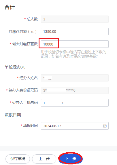 数据导入后跳转至在线填表界面,自动计算总人数、总金额,手工录入最大月缴存基数(上传文件中填写的最大缴存基数),点下一步到提交完成。