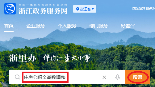 第二步:在“浙江政务服务网”首页搜索“住房公积金基数调整”,事项右侧点击“在线办理”。