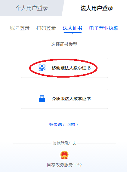 推荐使用“法人证书”—“移动版法人数字证书”登录。