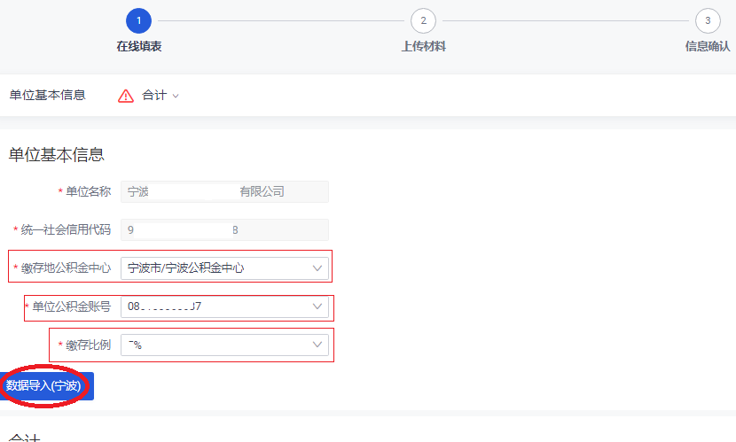进入填表页面,选择中心、单位账号后返显“缴存比例”,点击“数据导入(宁波)”。