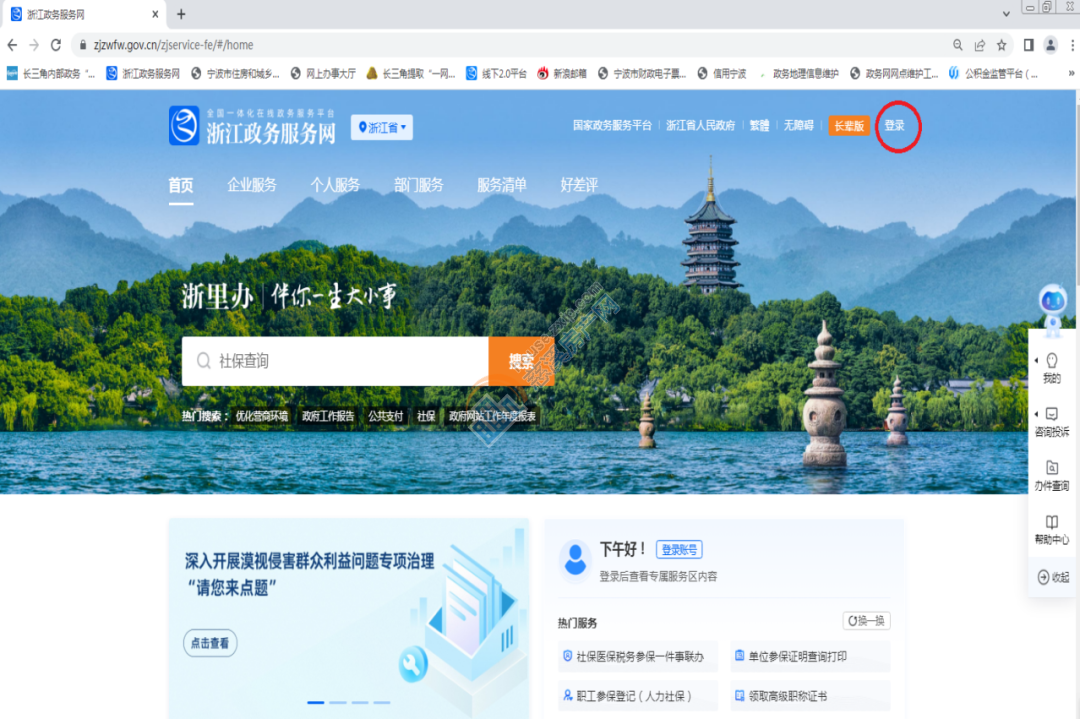 第一步:单位经办人登录“浙江政务服务网”(建议使用搜狗、谷歌浏览器)。