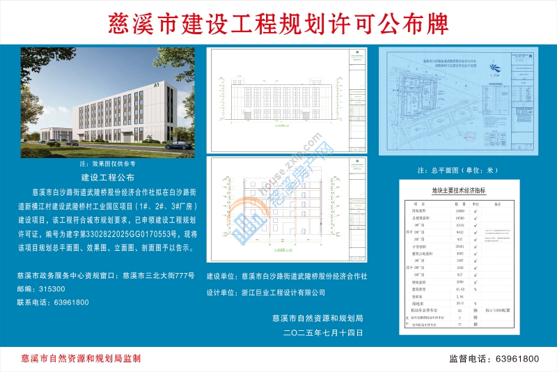 慈溪市白沙路街道武陵桥股份经济合作社拟在白沙路街道新横江村建设武陵桥村工业园区项目(1#、2#、3#厂房)建设项目,该工程符合城市规划要求,已申领建设工程规划许可证,编号为建字第3302822025GG0170553号,现将该项目规划总平面图、效果图予以告示。