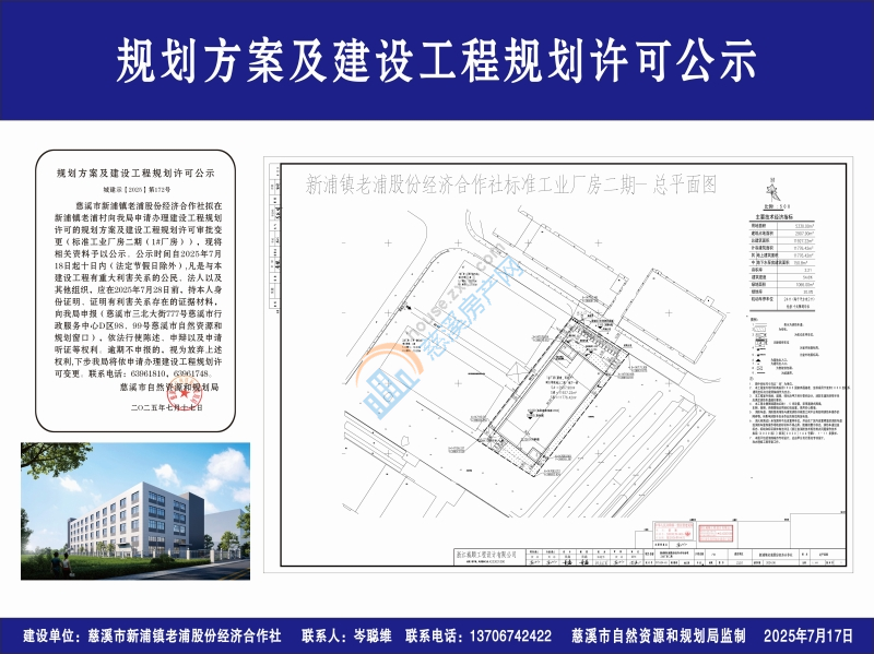 慈溪市新浦镇老浦股份经济合作社拟在新浦镇老浦村向我局申请办理建设工程规划许可的规划方案及建设工程规划许可审批变更(标准工业厂房二期(1#厂房)),现将相关资料予以公示。公示时间自2025年7月18日起十日内(法定节假日除外),凡是与本建设工程有重大利害关系的公民、法人以及其他组织,应在2025年7月28日前,持本人身份证明、证明有利害关系存在的证据材料,向我局申报(慈溪市三北大街777号慈溪市行政服务中心D区98、99号慈溪市自然资源和规划窗口),依法行使陈述、申辩以及申请听证等权利。逾期不申报的,视为放弃上述权利,下步我局将依申请办理建设工程规划许可变更。联系电话:63961810,63961748。