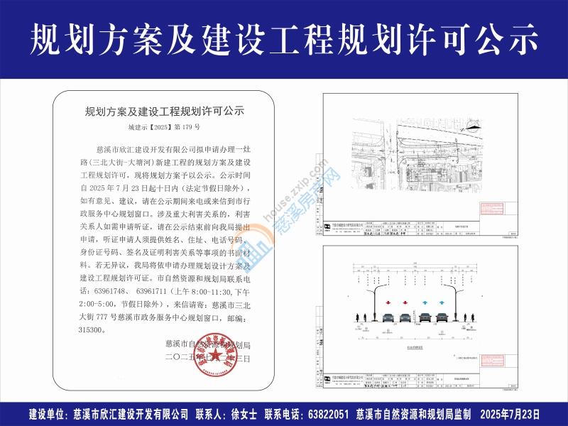 慈溪市欣汇建设开发有限公司拟申请办理一灶路(三北大街-大塘河)新建工程的规划方案及建设工程规划许可,现将规划方案予以公示。公示时间自2025年7月23日起十日内(法定节假日除外),如有意见、建议,请在公示期间来电或来信到市行政服务中心规划窗口。涉及重大利害关系的,利害关系人如需申请听证,请在公示结束前向我局提出申请,听证申请人须提供姓名、住址、电话号码、身份证号码、签名及证明利害关系等事项的书面材料。若无异议,我局将依申请办理规划设计方案及建设工程规划许可证。市自然资源和规划局联系电话:63961748、 63961711(上午8:00-11:30,下午2:00-5:00,节假日除外),来信请寄:慈溪市三北大街777号慈溪市政务服务中心规划窗口,邮编:315300。