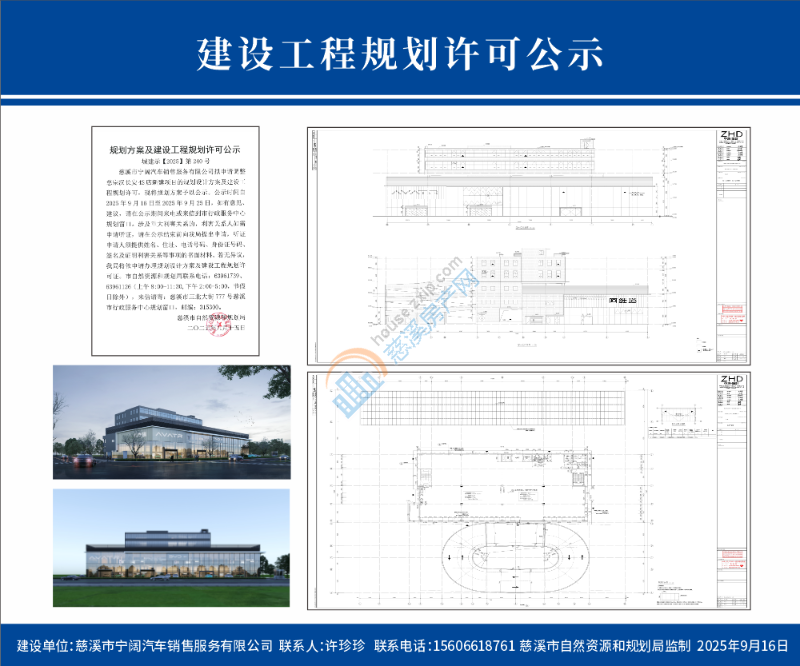 慈溪市宁阔汽车销售服务有限公司拟申请调整慈宗汉长安4S店新建项目的规划设计方案及建设工程规划许可,现将规划方案予以公示。公示时间自2025年9月16日至2025年9月25日,如有意见、建议,请在公示期间来电或来信到市行政服务中心规划窗口。涉及重大利害关系的,利害关系人如需申请听证,请在公示结束前向我局提出申请,听证申请人须提供姓名、住址、电话号码、身份证号码、签名及证明利害关系等事项的书面材料。若无异议,我局将依申请办理规划设计方案及建设工程规划许可证。市自然资源和规划局联系电话:63961739、63961126(上午8:00-11:30,下午2:00-5:00,节假日除外),来信请寄:慈溪市三北大街777号慈溪市行政服务中心规划窗口,邮编:315300。