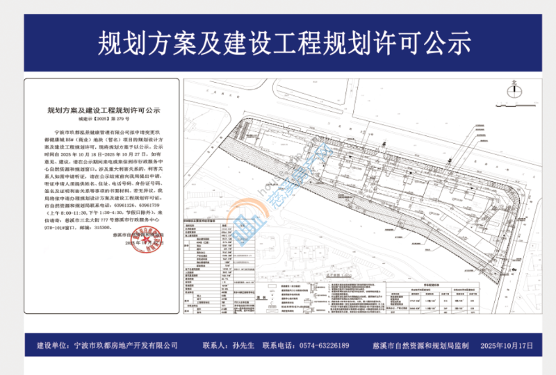 宁波市玖都泓景健康管理有限公司拟申请变更玖都健康城B5#(商业)地块(暂名)项目的规划设计方案及建设工程规划许可,现将规划方案予以公示。公示时间自2025年10月18日-2025年10月27日,如有意见、建议,请在公示期间来电或来信到市行政服务中心自然资源和规划窗口。涉及重大利害关系的,利害关系人如需申请听证,请在公示结束前向我局提出申请,听证申请人须提供姓名、住址、电话号码、身份证号码、签名及证明利害关系等事项的书面材料。若无异议,我局将依申请办理规划设计方案及建设工程规划许可证。市自然资源和规划局联系电话:63961126、63961739(上午8:00-11:30,下午1:30-4:30,节假日除外),来信请寄:慈溪市三北大街777号慈溪市行政服务中心97#-101#窗口,邮编:315300。