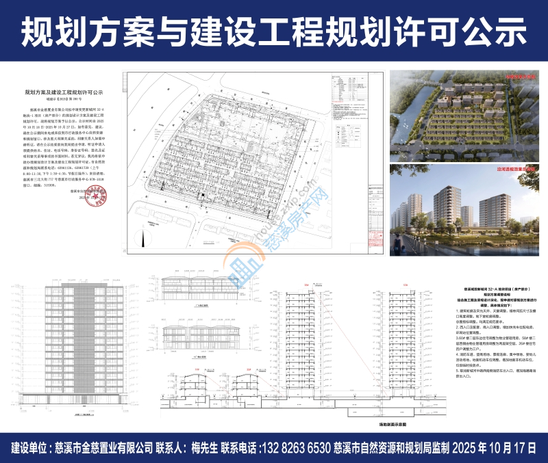 慈溪市金慈置业有限公司拟申请变更新城河32-A地块-1项目(房产部分)的规划设计方案及建设工程规划许可,现将规划方案予以公示。公示时间自2025年10月18日-2025年10月27日,如有意见、建议,请在公示期间来电或来信到市行政服务中心自然资源和规划窗口。涉及重大利害关系的,利害关系人如需申请听证,请在公示结束前向我局提出申请,听证申请人须提供姓名、住址、电话号码、身份证号码、签名及证明利害关系等事项的书面材料。若无异议,我局将依申请办理规划设计方案及建设工程规划许可证。市自然资源和规划局联系电话:63961126、63961739(上午8:00-11:30,下午1:30-4:30,节假日除外),来信请寄:慈溪市三北大街777号慈溪市行政服务中心97#-101#窗口,邮编:315300。