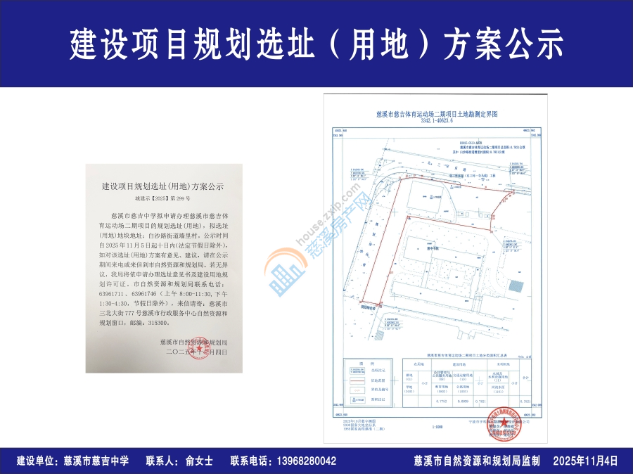 慈溪市慈吉中学拟申请办理慈溪市慈吉体育运动场二期项目的规划选址(用地),拟选址(用地)地块地址:白沙路街道墙里村。公示时间自2025年11月5日起十日内(法定节假日除外),如对该选址(用地)方案有意见、建议,请在公示期间来电或来信到市自然资源和规划局。若无异议,我局将依申请办理选址意见书及建设用地规划许可证。市自然资源和规划局联系电话:63961711、63961746(上午8:00-11:30,下午1:30-4:30,节假日除外),来信请寄:慈溪市三北大街777号慈溪市行政服务中心自然资源和规划窗口,邮编:315300。