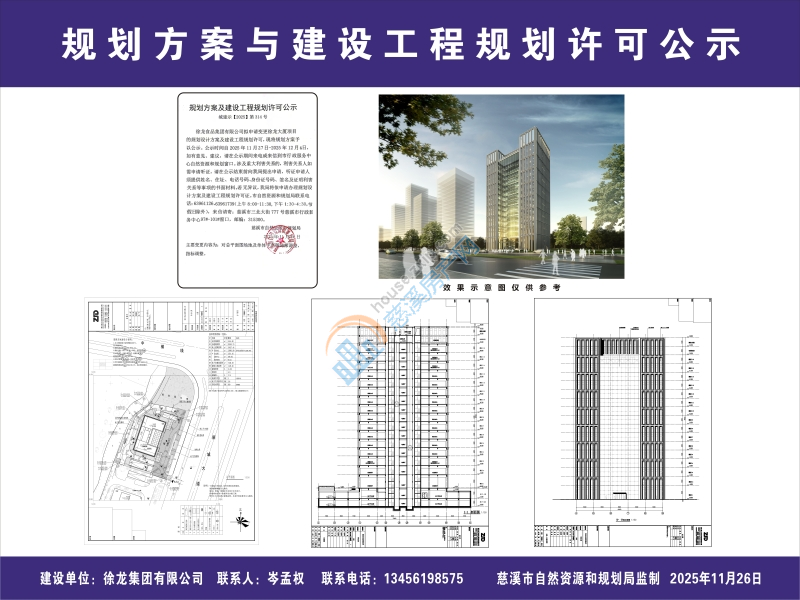 徐龙食品集团有限公司拟申请变更徐龙大厦项目的规划设计方案及建设工程规划许可,现将规划方案予以公示。公示时间自2025年11月27日-2025年12月6日,如有意见、建议,请在公示期间来电或来信到市行政服务中 心自然资源和规划窗口。涉及重大利害关系的,利害关系人如 需申请听证,请在公示结束前向我局提出申请,听证申请人 须提供姓名、住址、电话号码、身份证号码、签名及证明利害 关系等事项的书面材料。若无异议,我局将依申请办理规划设 计方案及建设工程规划许可证。市自然资源和规划局联系电 话:63961126、63961739(上午8:00-11:30,下午1:30-4:30,节 假日除外),来信请寄:慈溪市三北大街777号慈溪市行政服 务中心97#-101#窗口,邮编:315300。