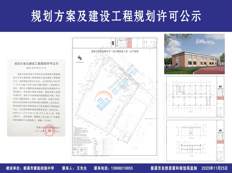 慈溪市掌起初级中学拟申请办理慈溪市掌起初级中学综合楼新建工程的规划方案及建设工程规划许可,现将规划方案予以公示。公示时间自2025年11月26日起十日内(法定节假日除外),如有意见、建议,请在公示期间来电或来信到市行政服务中心规划窗口。涉及重大利害关系的,利害关系人如需申请听证,请在公示结束前向我局提出申请,听证申请人须提供姓名、住址、电话号码、身份证号码、签名及证明利害关系等事项的书面材料。若无异议,我局将依申请办理规划设计方案及建设工程规划许可证。市自然资源和规划局联系电话:63961748、 63961711(上午8:00-11:30,下午1:30-4:30,节假日除外),来信请寄:慈溪市三北大街777号慈溪市政务服务中心规划窗口,邮编:315300。