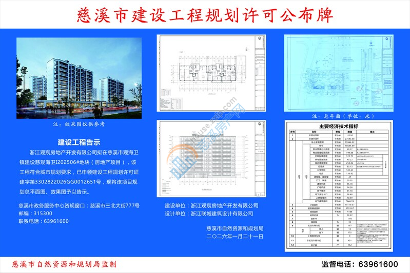浙江观宸房地产开发有限公司拟在慈溪市观海卫镇建设慈观海卫I202506#地块(房地产项目),该工程符合城市规划要求,已申领建设工程规划许可证建字第3302822026GG0012651号,现将该项目规划总平面图、效果图予以告示。
