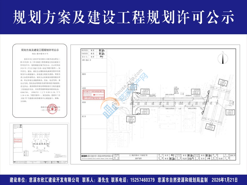 慈溪市欣汇建设开发有限公司拟申请办理文二路(彭民路-东三环)新建工程的规划方案及建设工程规划许可,现将规划方案予以公示。公示时间自2026年1月22日起十日内(法定节假日除外),如有意见、建议,请在公示期间来电或来信到市行政服务中心规划窗口。涉及重大利害关系的,利害关系人如需申请听证,请在公示结束前向我局提出申请,听证申请人须提供姓名、住址、电话号码、身份证号码、签名及证明利害关系等事项的书面材料。若无异议,我局将依申请办理规划设计方案及建设工程规划许可证。市自然资源和规划局联系电话:63961748、 63961711(上午8:00-11:30,下午1:30-4:30,节假日除外),来信请寄:慈溪市三北大街777号慈溪市政务服务中心规划窗口,邮编:315300。