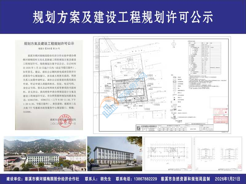 慈溪市横河镇梅园股份经济合作社拟申请办理横河镇梅园村文化礼堂新建工程的规划方案及建设工程规划许可,现将规划方案予以公示。公示时间自2026年1月22日起十日内(法定节假日除外),如有意见、建议,请在公示期间来电或来信到市行政服务中心规划窗口。涉及重大利害关系的,利害关系人如需申请听证,请在公示结束前向我局提出申请,听证申请人须提供姓名、住址、电话号码、身份证号码、签名及证明利害关系等事项的书面材料。若无异议,我局将依申请办理规划设计方案及建设工程规划许可证。市自然资源和规划局联系电话:63961748、 63961711(上午8:00-11:30,下午1:30-4:30,节假日除外),来信请寄:慈溪市三北大街777号慈溪市政务服务中心规划窗口,邮编:315300。