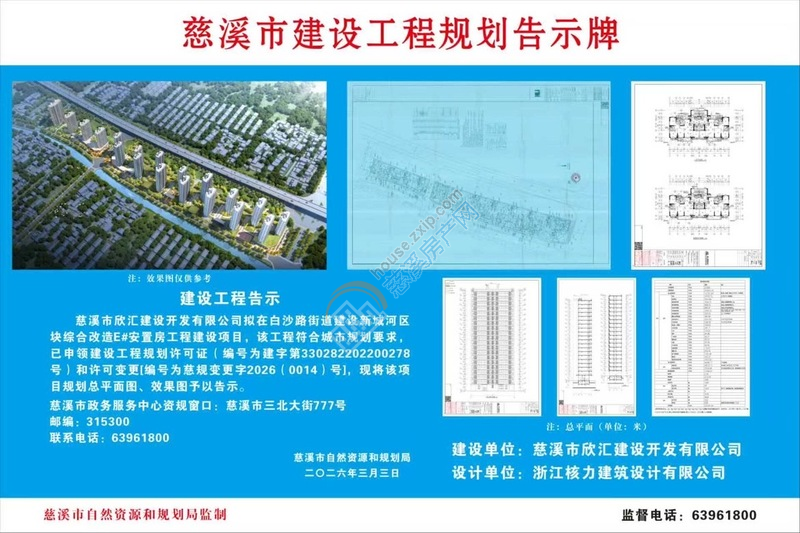 慈溪市欣汇建设开发有限公司拟在白沙路街道建设新城河区块综合改造E#安置房工程建设项目,该工程符合城市规划要求,已申领建设工程规划许可证(编号为建字第330282202200278号)和许可变更[编号为慈规变更字2026(0014)号],现将该项目规划总平面图、效果图予以告示。