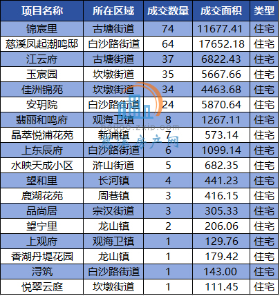 玉宸园(坎墩街道)成交35套,佳洲锦苑(坎墩街道)成交34套,坎墩街道两大项目合计贡献69套,成为本月第三极。