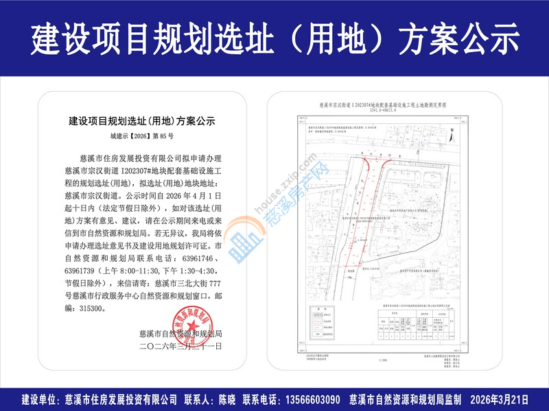 慈溪市住房发展投资有限公司拟申请办理慈溪市宗汉街道I202307#地块配套基础设施工程的规划选址(用地),拟选址(用地)地块地址:慈溪市宗汉街道。公示时间自2026年4月1日起十日内(法定节假日除外),如对该选址(用地)方案有意见、建议,请在公示期间来电或来信到市自然资源和规划局。若无异议,我局将依申请办理选址意见书及建设用地规划许可证。市自然资源和规划局联系电话:63961746、63961739(上午8:00-11:30,下午1:30-4:30,节假日除外),来信请寄:慈溪市三北大街777号慈溪市行政服务中心自然资源和规划窗口,邮编:315300。
