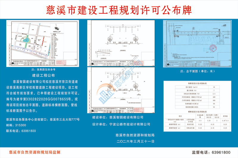 慈溪智园建设有限公司拟在慈溪市宗汉街道建设慈溪高新区学校配套道路工程建设项目,该工程符合城市规划要求,已申领建设工程规划许可证,编号为建字第3302822026GG0078655号,现将该项目规划总平面图、效果图予以告示。