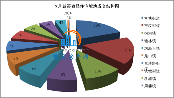 9份慈溪商品住宅版块成交中,城区楼盘(浒山街道、古塘街道、白沙路街道、坎墩街道、宗汉街道)成交269套,环比上涨59.17%,占总成交量的55.35%;成交均价14263.71元/㎡,环比上涨27.02%。成交量前三版块:古塘街道成交备案94套,占19%;宗汉街道成交备案88套,占18%;横河镇成交备案50套,占10%。