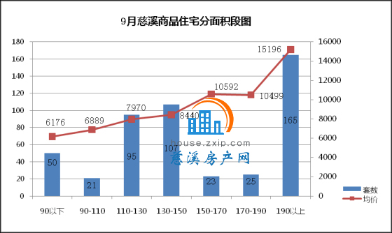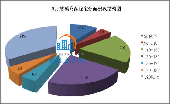 9月慈溪商品住宅分面积段成交中,190㎡以上大面积为最热门户型,共计165套,成交均价15196元/㎡,占总成交套数的34%;130-150㎡面积段产品成交107套,成交均价8440元/㎡,占总成交套数的22%,销量排名第二;110-130㎡面积段产品成交95套,成交均价7970元/㎡,占总成交套数的20%,销量排名第三。