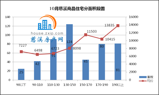 10月慈溪商品住宅分面积段成交中,130-150㎡面积段为最热门户型,共计124套,成交均价8098元/㎡,占总成交套数的25%;110-130㎡面积段产品成交91套,成交均价6723元/㎡,占总成交套数的19%,销量排名第二;190㎡以上面积段产品成交81套,成交均价13835元/㎡,占总成交套数的17%,销量排名第三。