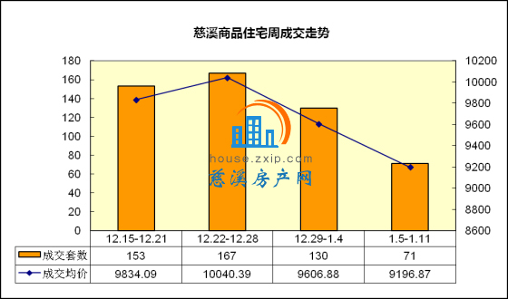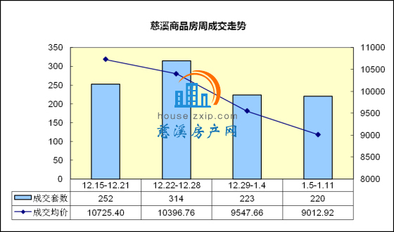 慈溪上周(1.5-1.11)成交各类房源(含住宅、公寓、商铺、写字楼和车库)共计220套,成交均价9012.92元/㎡,成交面积15130方。环比上上周成交量下跌1.35%,成交均价下跌5.60%,成交面积下跌39.69%。