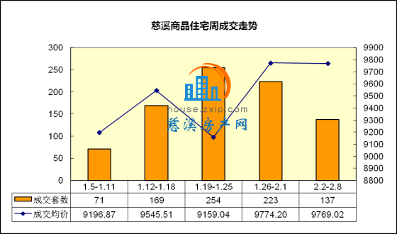 上周商品住宅成交137套,成交均价9769.02元/㎡,成交面积22330方。环比上上周成交量下跌38.57%,成交均价微跌0.05%,成交面积下跌42.54%。在经历了前两周的成交小高潮后,慈溪商品住宅成交明显回落。当然随着春节的临近,成交下跌也属于正常现象。