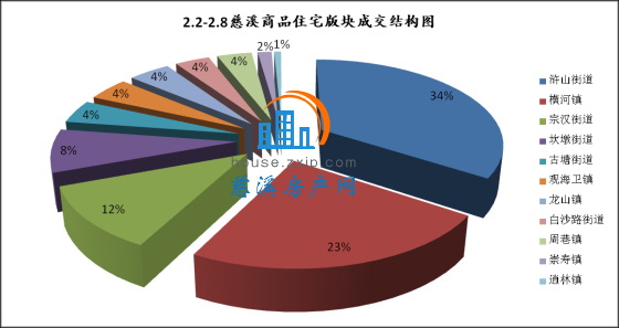 慈溪商品住宅各版块成交情况中,城区版块(浒山街道、古塘街道、白沙路街道、宗汉街道、坎墩街道)共成交85套,成交均价10521.72元/㎡。排名前三版块:浒山街道备案47套,占34%;横河镇备案32套,占23%;宗汉街道备案16套,占12%。