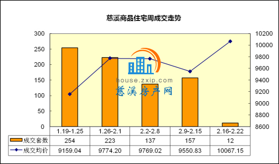 慈溪上周(2.16-2.22)成交各类房源(含住宅、公寓、商铺、写字楼和车库)共计21套,成交均价9291.42元/㎡,成交面积2054方。环比上上周成交量下跌93.69%,成交均价下跌4.10%,成交面积下跌93.62%。