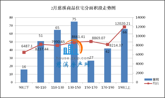 2月慈溪商品住宅分面积段成交中,130-150㎡面积段为最热门户型,共计75套,成交均价8661.41元/㎡,占总成交套数的22%;190㎡以上面积段产品成交66套,成交均价12020.21元/㎡,占总成交套数的19%,销量排名第二;110-130㎡面积段产品成交65套,成交均价7990.65元/㎡,占总成交套数的19%,销量排名第三。