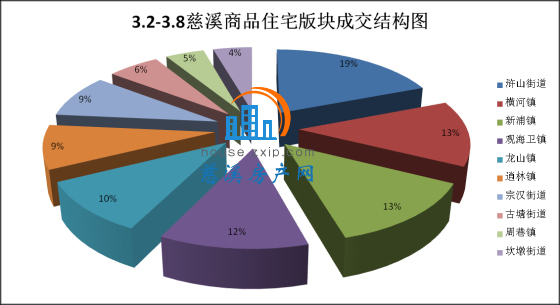 慈溪商品住宅各版块成交情况中,城区版块(浒山街道、古塘街道、白沙路街道、宗汉街道、坎墩街道)共成交26套,成交均价8943.72元/㎡。排名前三版块:浒山街道备案13套,占19%;横河镇与新浦镇各备案9套,各占13%;观海卫镇备案8套,占11%。