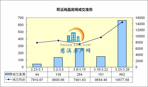 慈溪上周(3.23-3.29)成交各类房源(含住宅、公寓、商铺、写字楼和车库)共计662套,成交均价14577.68元/㎡,成交面积64323方。环比上上周成交量上涨338.41%,成交均价上涨50.99%,成交面积上涨300.69%。