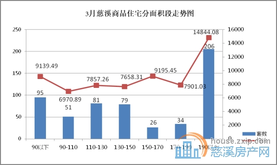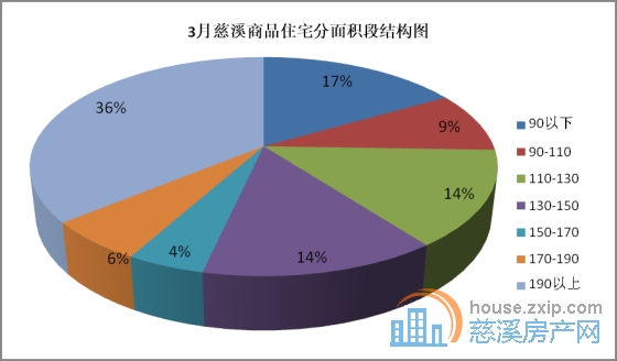 3月慈溪商品住宅分面积段成交中,190㎡以上面积段为最热门户型,共计206套,成交均价14844.08元/㎡,占总成交套数的36%;90㎡以下面积段产品成交95套,成交均价9139.49元/㎡,占总成交套数的17%,销量排名第二;110-130㎡面积段产品成交81套,成交均价7857.26元/㎡,占总成交套数的14%,销量排名第三。
