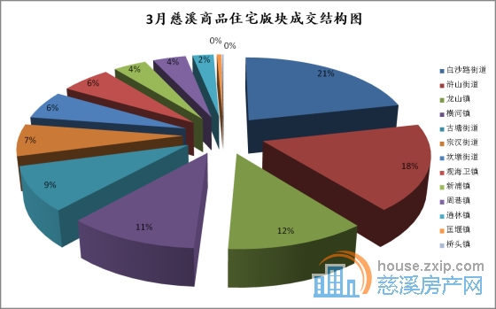 3月慈溪商品住宅版块成交中,城区楼盘(浒山街道、古塘街道、白沙路街道、坎墩街道、宗汉街道)成交349套,成交均价15033.02元/㎡。成交量排名前三版块:白沙路街道成交备案123套,占21%;浒山街道成交备案102套,占18%;龙山镇成交备案66套,占12%。
