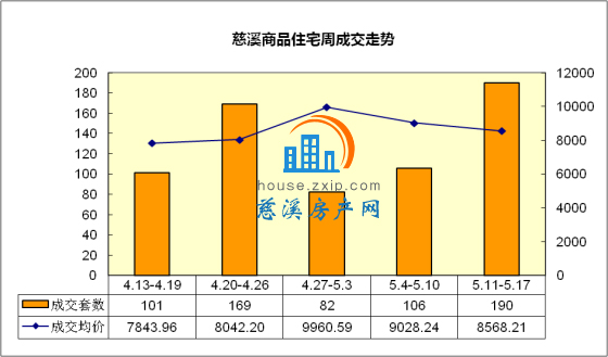 慈溪上周(5.11-5.17)成交各类房源(含住宅、公寓、商铺、写字楼和车库)共计345套,成交均价8356.86元/㎡,成交面积32011方。环比上上周成交量上涨60.47%,成交均价上涨17.61%,成交面积上涨25.78%。