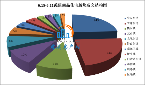 慈溪商品住宅(含别墅)各版块成交情况中,城区版块(浒山街道、古塘街道、白沙路街道、宗汉街道、坎墩街道)共成交71套,成交均价10623.66元/㎡。排名前三版块:宗汉街道备案27套,占24%;古塘街道备案26套,占23%;横河镇备案12套,占11%。